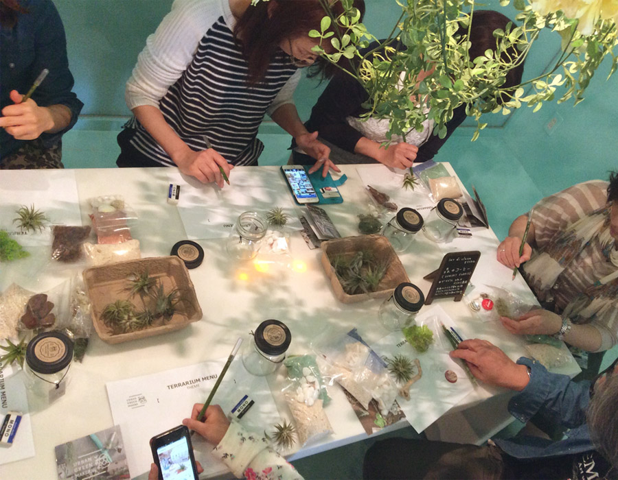2016.04.09 テラリウム ワークショップ「ライフスタイルに合わせてカスタマイズできるグリーン」をコンセプトとしたブランド"URBAN GREEN MAKERS"(アーバン グリーン メーカーズ)のプロデューサー・新田さんを講師に迎えて、テラリウムづくりのワークショップを開催しました。ガラス瓶の中にカラーサンド(砂)や貝殻やなどのオプションパーツを入れて、自分だけのオリジナルのテラリウムを作りました。※この日は、地域イベントgood day iriyaのスタンプラリーも同時開催されまれした |